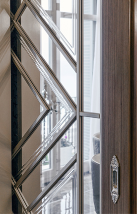 The complex graphic glazing of the partitions in champagne-coloured lacquer finishing, as well as the chamfered glass decor - make these partitions the accent element of the living room.
