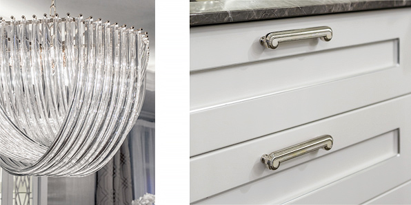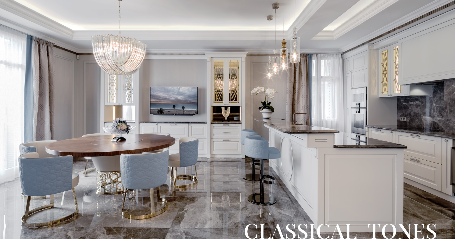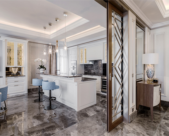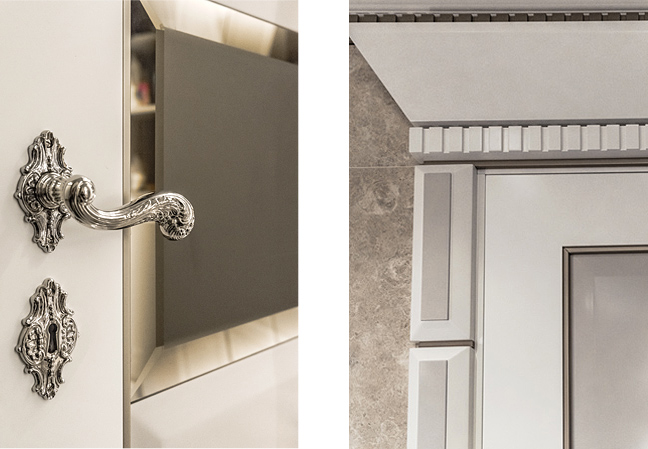 The kitchen furniture designed by NG-STUDIO features a light-colored lacquer facade decorated with "foglie argento" and combines classical elements with Art Deco notes.