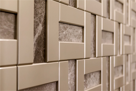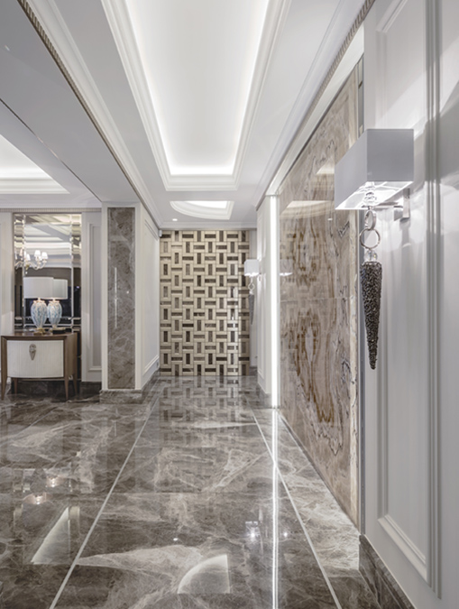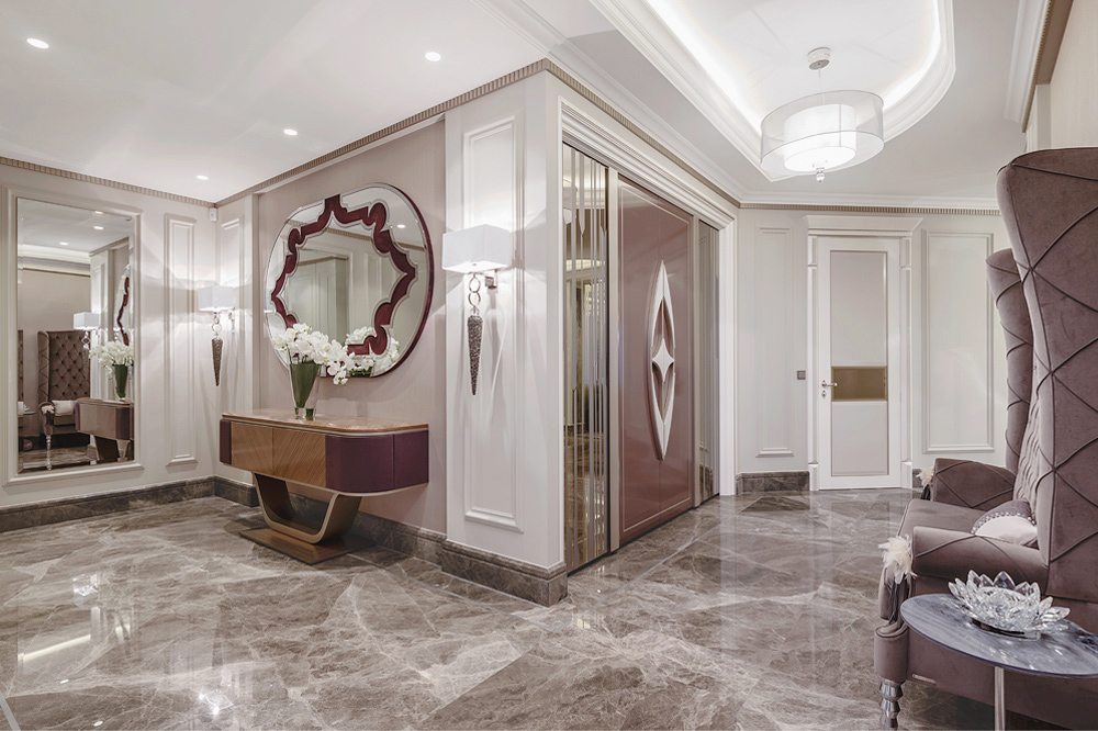 On the wall of the corridor leading into the private wing of the apartment, is the decorative Onyx Cappuccino marble panel with a book matched layout with ornamented bronze glass panels. The combination of these two contrasting materials, create the dominant by effectively decorating the wall.