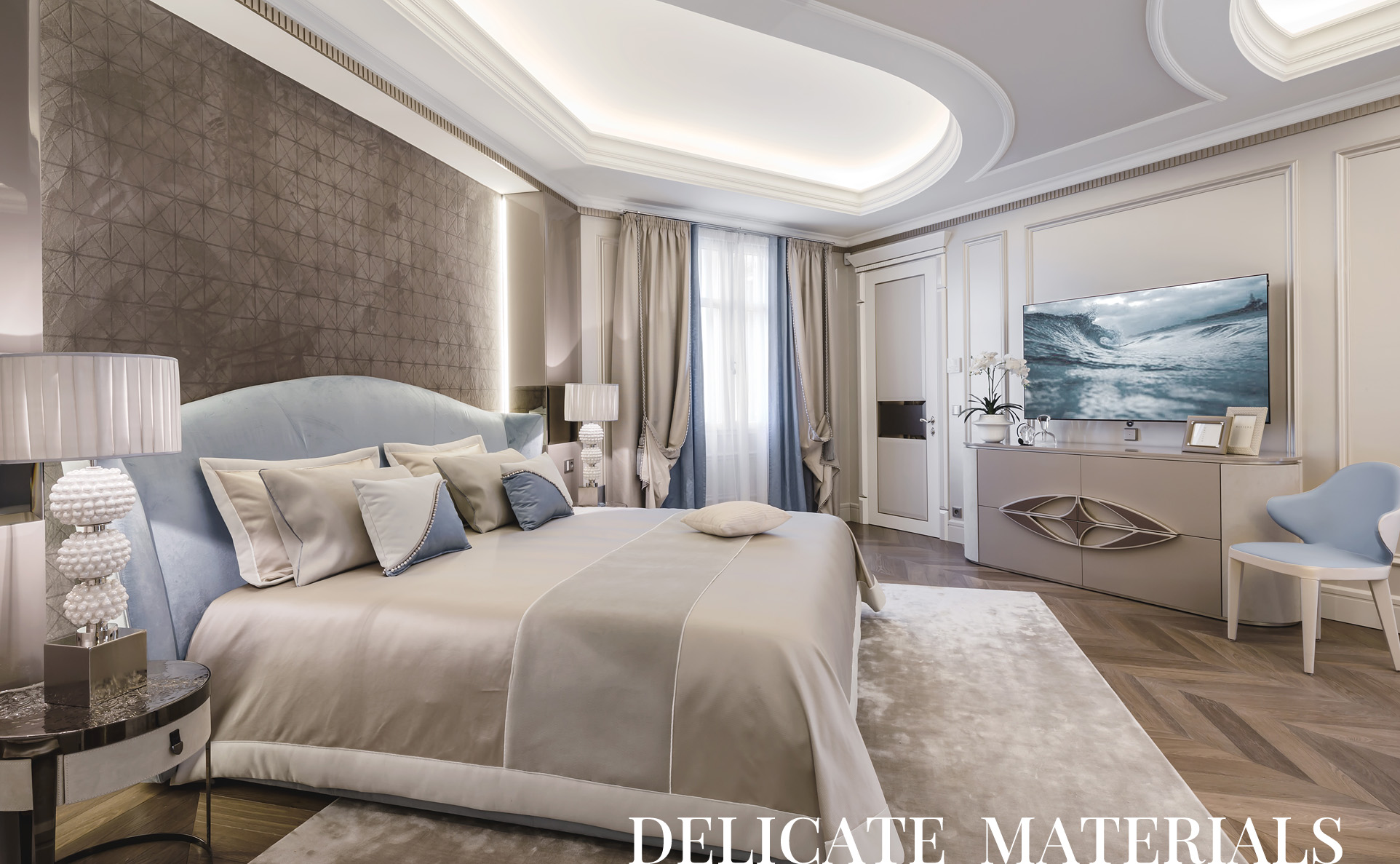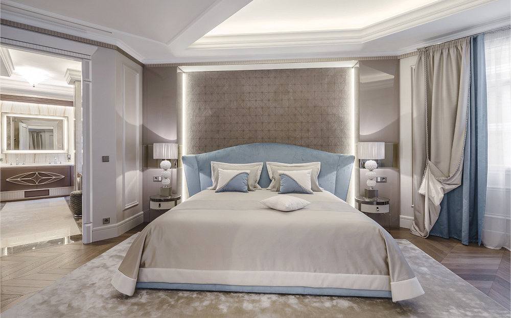 The master wing design features neutral shades, the main color is pearl-blue used in the bed headboard, curtains and decorative pillows. Walls and ceilings are decorated with plaster moldings and cornices. Walls have a particular pearly-shine finishing it adds a softness and elegance to this interior.