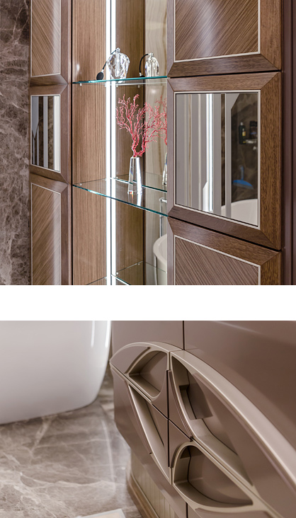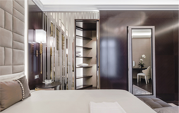 The private guest zone includes three functional areas: a bedroom area , a dressing area and a bathroom, which were arranged by the wardrobe in wenge veneer finish with decorative bronze mirrors. The headboard wall was designed using suede upholstered modules as the centre with wenge veneered panels on its sides.