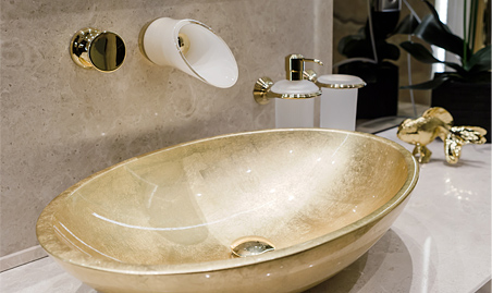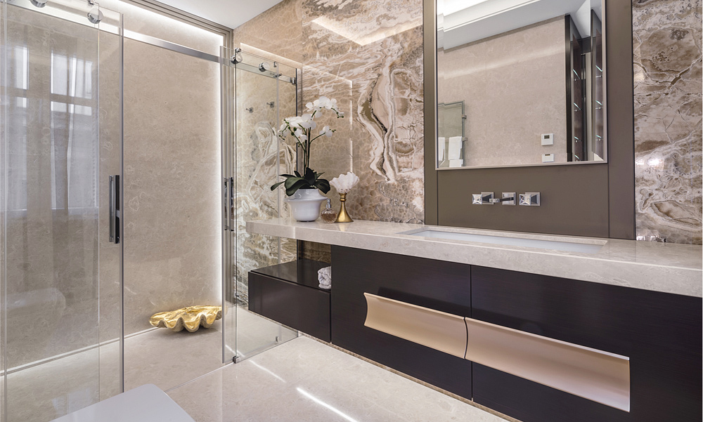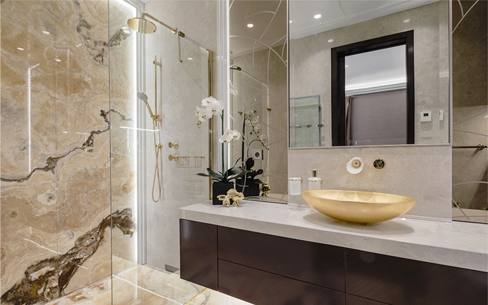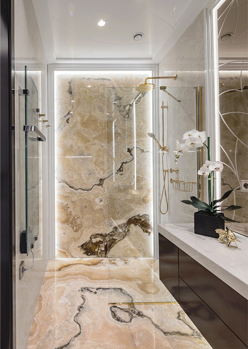 The golden finishing from the bedroom found its use in the bathroom, as a color tone of the spectacular Honey Onyx marble which was laid with particular attention to preserving its natural pattern made the bathroom's interior refined and luxurious.