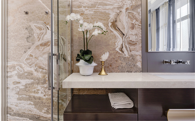 The main decorative element of the guest bathroom is the wall in the Onyx Cappuccino marble. Each tile was laid with particular attention to preserving its natural pattern .