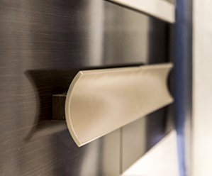 Here, as well as in the hall, have used such decorative techniques as a milled champagne-coloured profile, bronze mirror with the same matte pattern, and also particular furniture handles.
