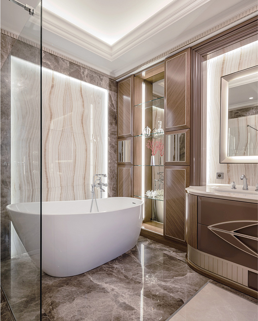 The master bathroom completes the interior with the same color solution used for the entrance area. It combines with the veneer finish used for the furniture in the master bedroom and dressing room.