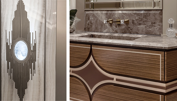 In order to balance the intensity of the marble, the composition of furniture with the sink, including the mirror has a more neutral design.