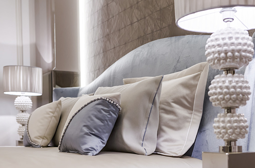 Bedside handmade lamps from Sigma L2, coupled with delicate natural fabrics and neoclassical gimp from Houles, makes the interior more decorative.