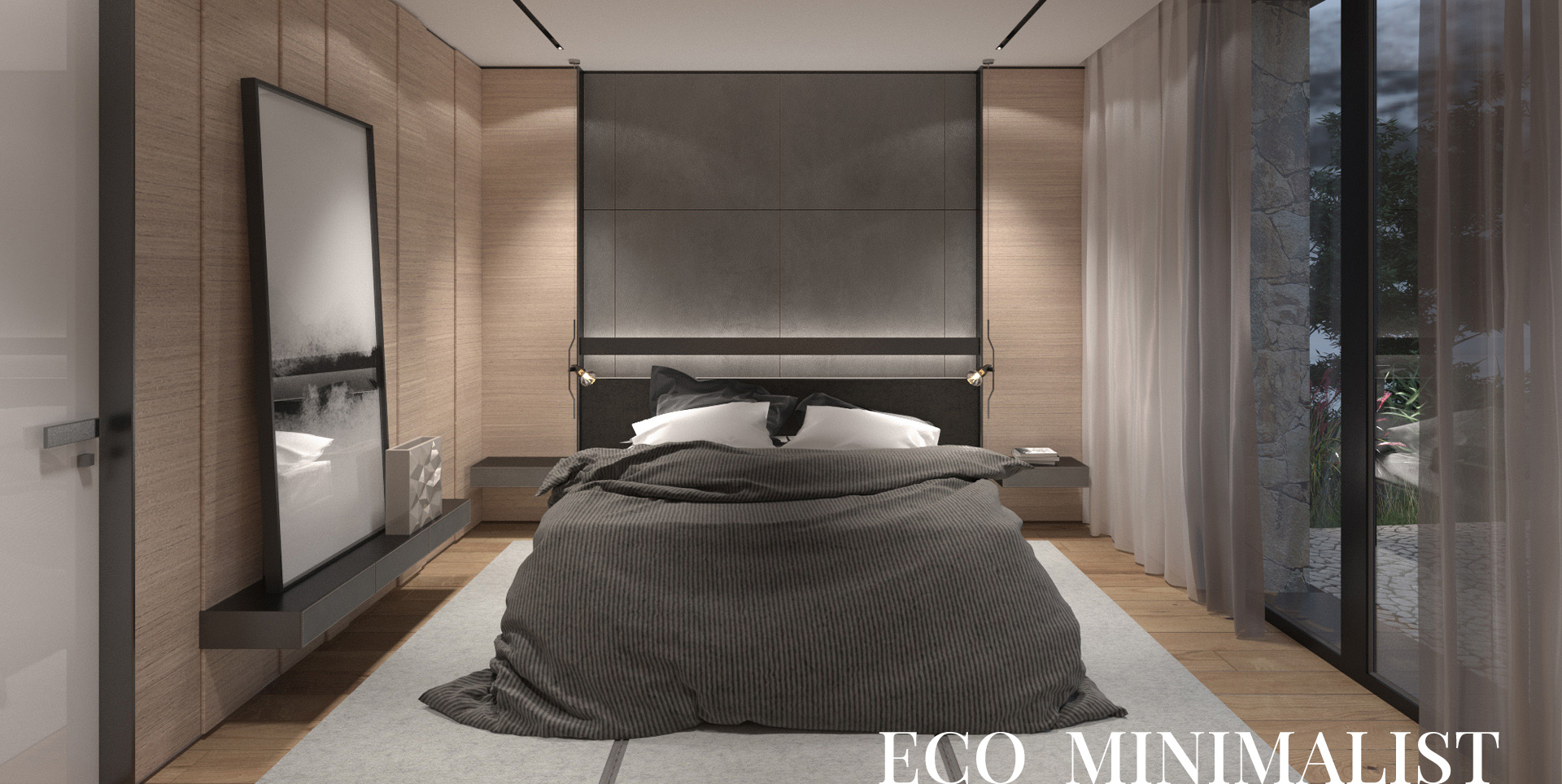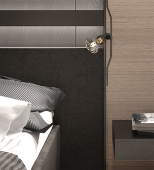 The mixture of characteristic natural rough textures with ideally smooth surfaces of modern style creates an intrigue in the interior. For example, a headboard made of a set of panels in textured veneer finish - contrasts with the "pure" lines of sliding partitions and modern interior items.