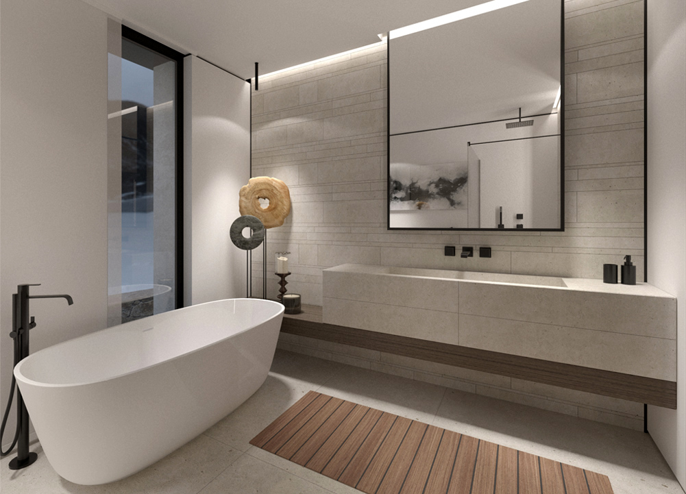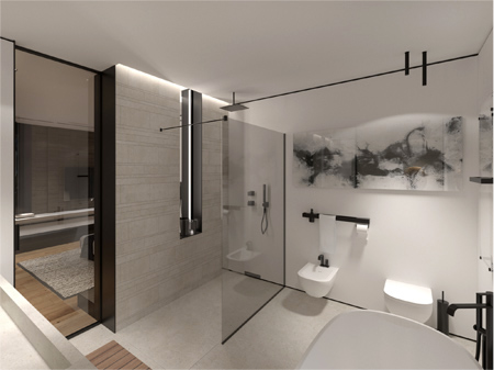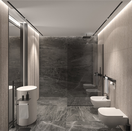 In contrast to the bedroom area, the private bathroom design is based on light colours. The use of Bianco Venezia marble with a semi-matte texture as a wall and floor finish - makes the interior soft and harmonious.