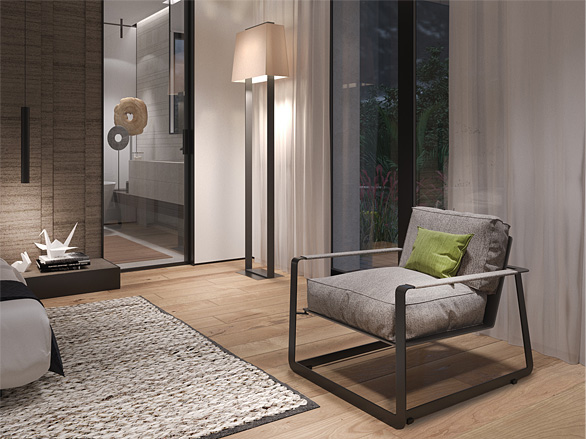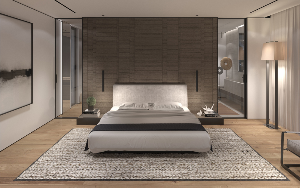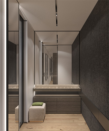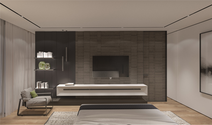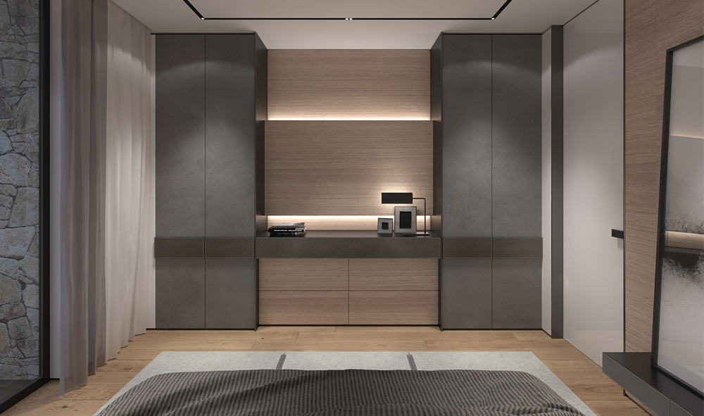 The guest room has a minimalistic design which based on the principle of an integration of furniture into the interior. The combination of warm shades of veneer with the texture of natural leather and dark metal as finish materials of walls and furniture - unites all the elements and makes the bedroom looks cozy and refined.
