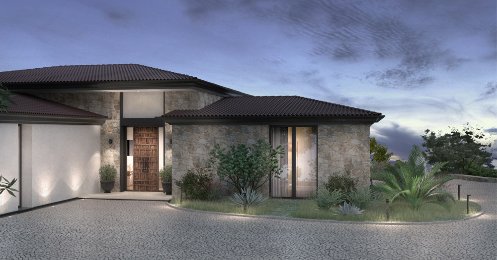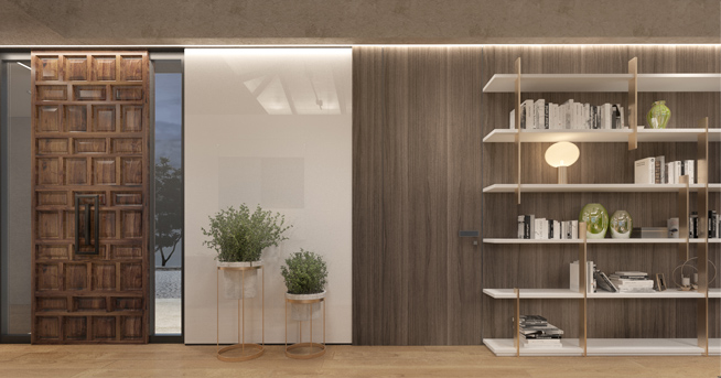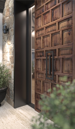 For example, the entrance door with a rough and aged texture is combined with side glass transom with a metal graphite finished frame and a whiteness of a glass wall panel.