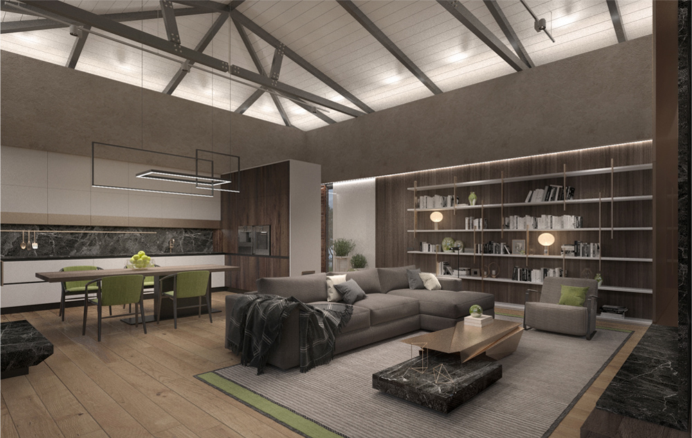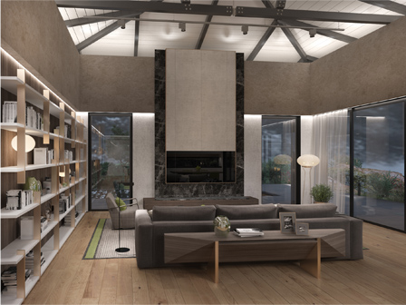 The sharp graphic lines of the roof truss reflects in the linear graphics of the bookcase and the polygonal shapes of the fireplace panel - these nuances are unite elements of the living room interior.