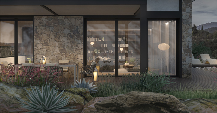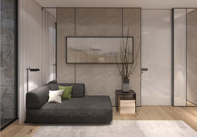The flow of hues and textures from the exterior to the interior creates a single harmonious image of the entire project, and the panoramic windows “blur” this border.