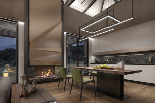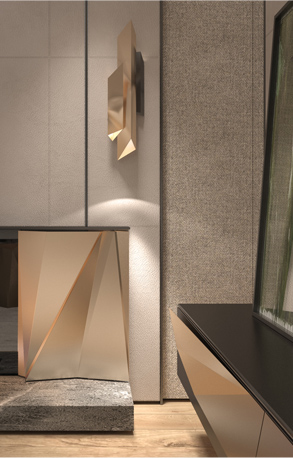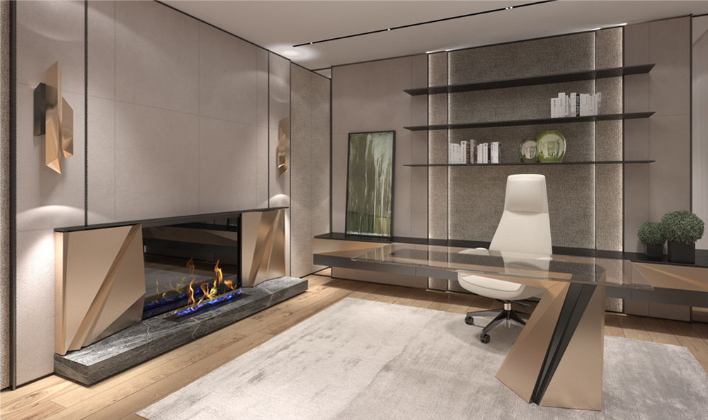 All accent elements, such as the wrighting desk of futuristic design with a polygonal metal base, the design of the fireplace and wall lamps, the design technique which repeats polygonal shapes - all these accent elements were exclusively designed by NG-STUDIO.