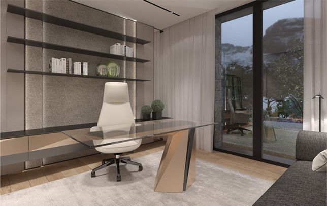 The interior of the home office - is a combination of natural materials with a semi-matte gloss of metal surfaces. The wall decoration using boiserie panels with different finish materials and with a buil-in light allows to break the monotony of the walls, and also to create compositional accents in the interior - for example, a wall with a fireplace and bookshelves.