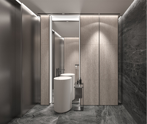 The interior of the guest bathroom is built on the combination of two types of marble Silver Gray and textured Bianco Venezia - this contrasting combination of planes enriches the internal architecture of the space. The doors of the built-in furniture near the sink are have the same Bianco Venezia marble finish as the walls.