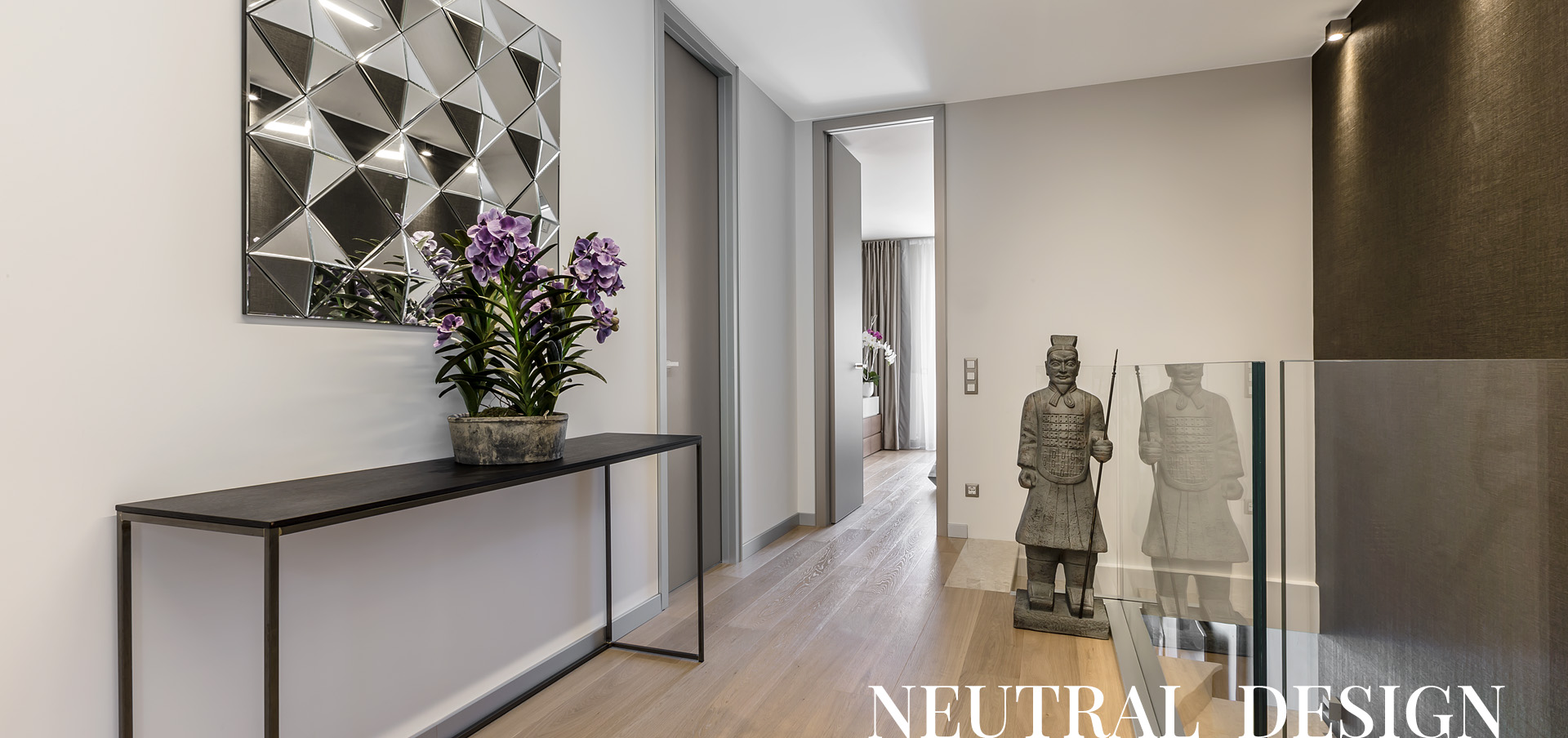 Natural shades and textures make the interior of the second floor harmonious and delicate, and the contrast is achieved due to the rough texture of wallpaper and graphic lines of the console.Neutrality interior is the background which effectively emphasizes decorative objects.