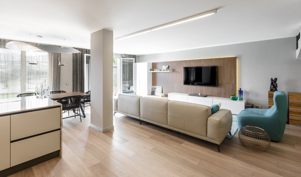 The landscape and the outdoor terrace with a beautiful panoramic view become a full-fledged continuation of the interior. This zone has become a favorite place for communication and relaxing.White color is mixed with bright accents of green and blue.