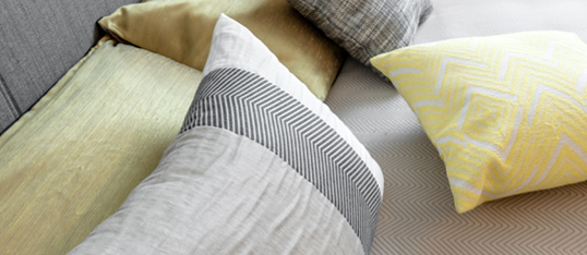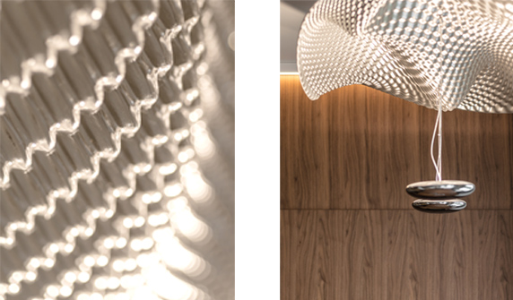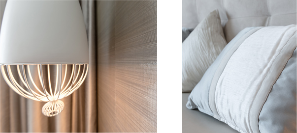 Natural bedhead wallpappers work in contrast with the smooth surface of the gypsum lamps, and the horizontal texture of the silk curtains combines with the delicate shine of the satin.