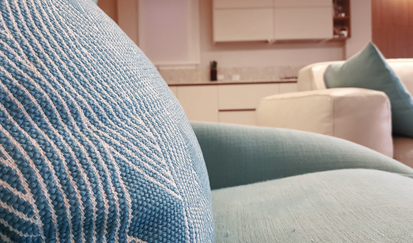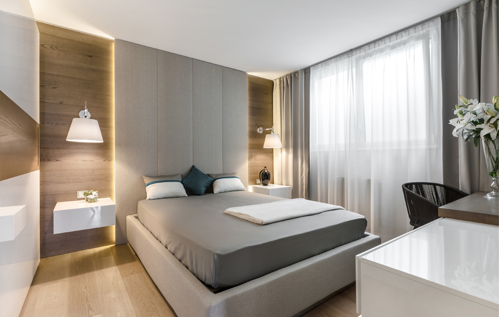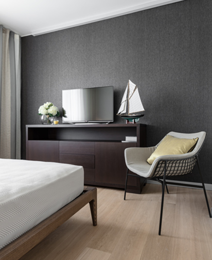 The interior of the guest zone is designed on the contrast of colours and textures.
