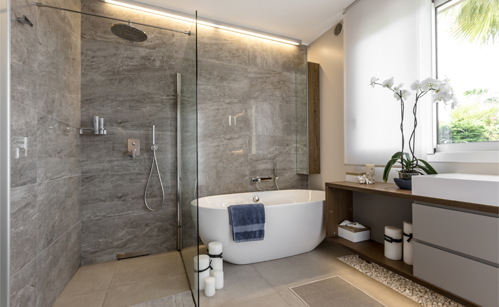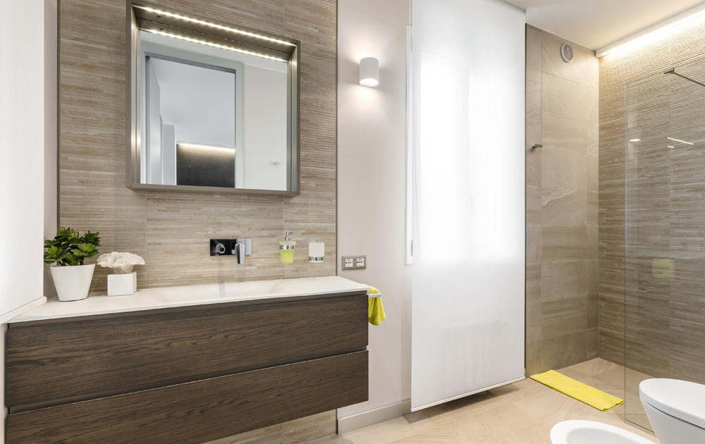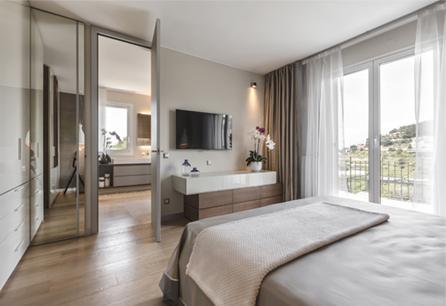 The interior of the bathroom is a natural extension of the bedroom. The concept of neutrality is also expresses in the use of marble and materials of natural shades.