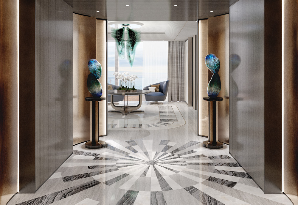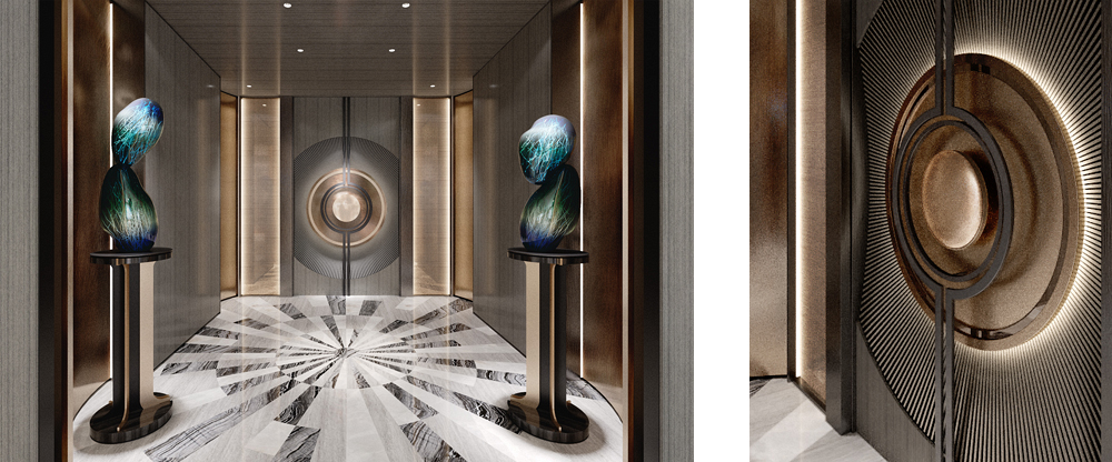 Sliding partitions, specially designed by NG-STUDIO, not only functionally zone the space, but they also are a decorative element of the interior - the graphic glass enclosure is underlined by a combination of materials. The wide, curved profile in the champagne colored lacquer finish - serves as a handle.Armchairs by Giorgetti.