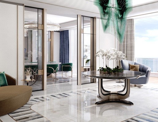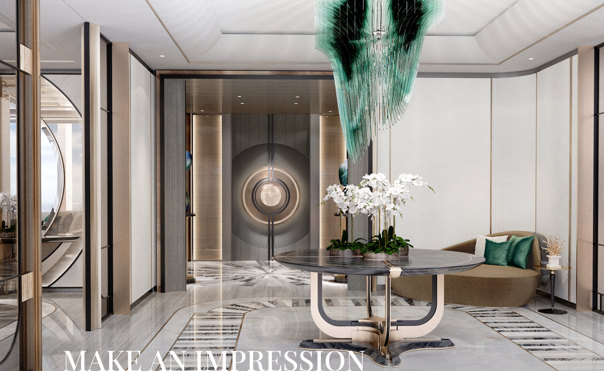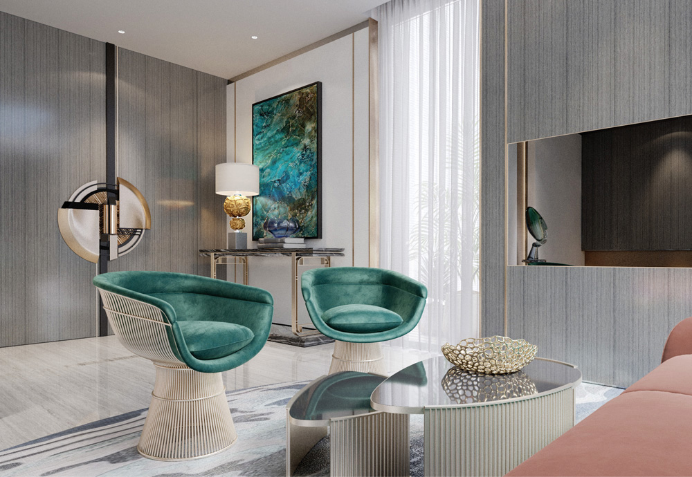 " The bright and extravagant interior of the penthouse was inspired by the brilliant Art Deco style in its heyday. This interior is distinguished by, extraordinary author's solutions and a specially designed furniture, which makes it unique and exclusive. The use of luxurious materials and their delicate combination - emphasizes the high status of the interior. Immerse yourself in the magnificent and inspiring world of Art Deco. "