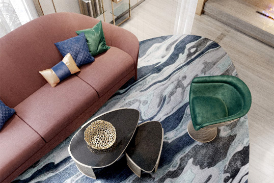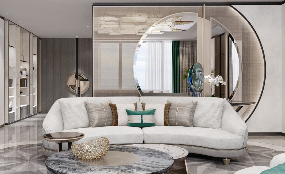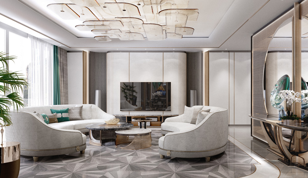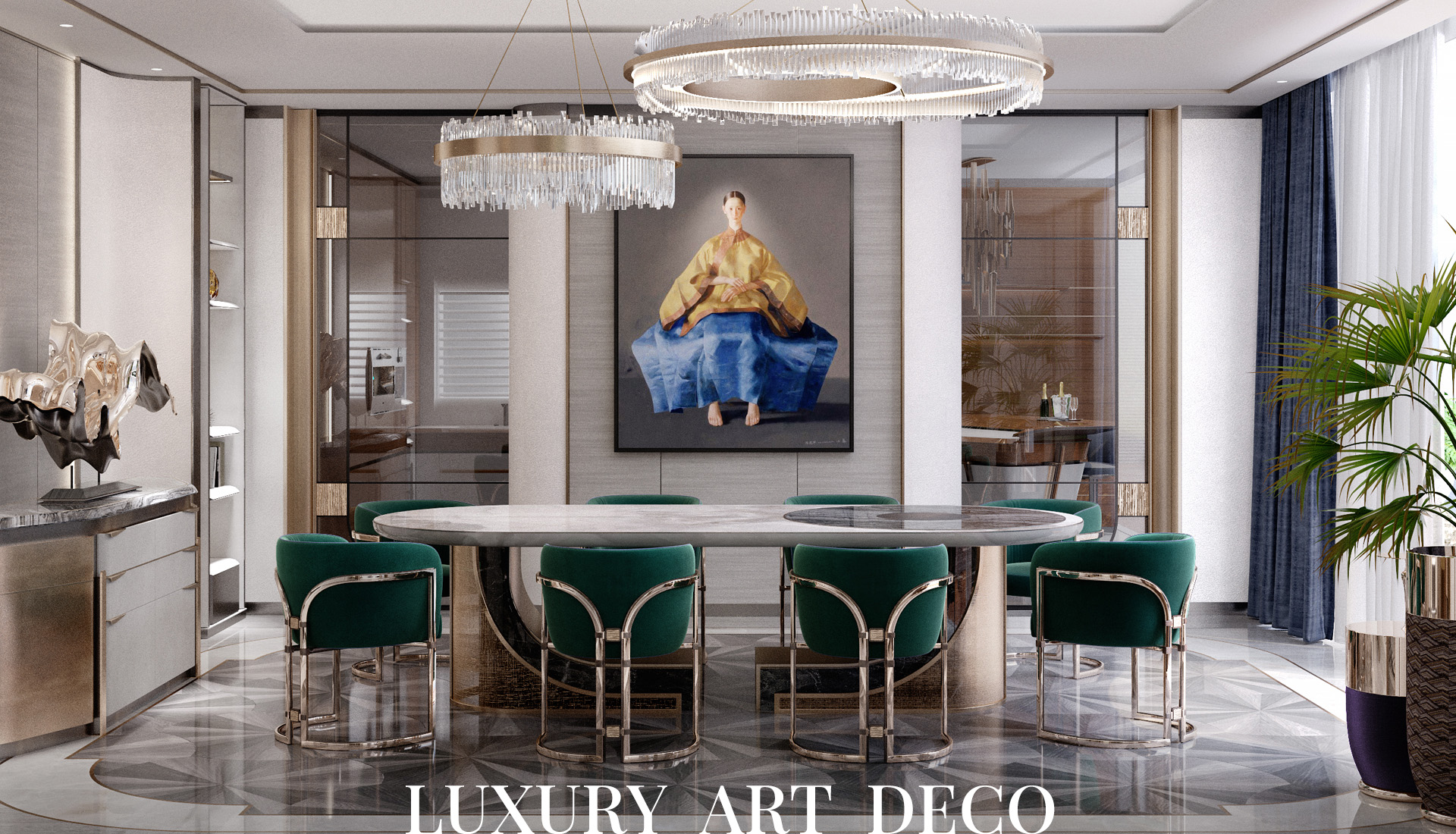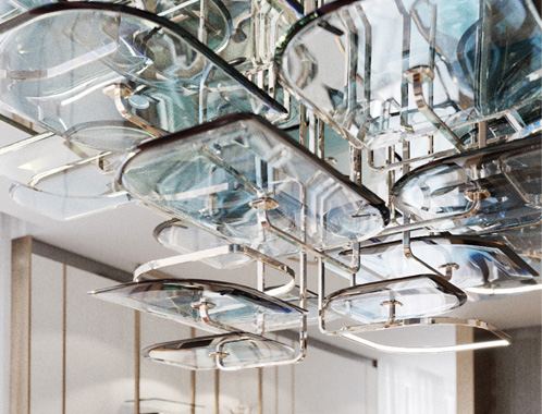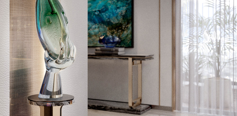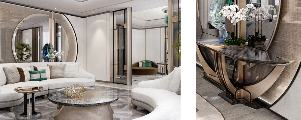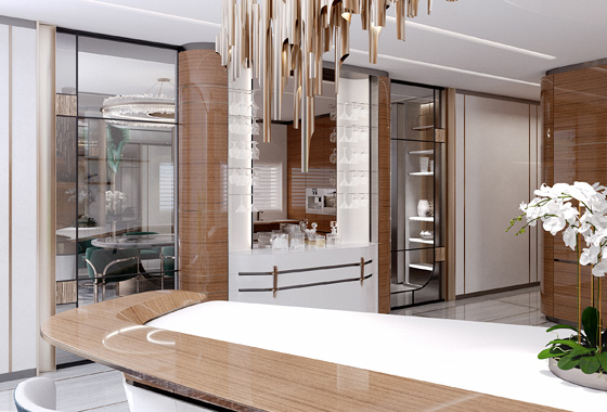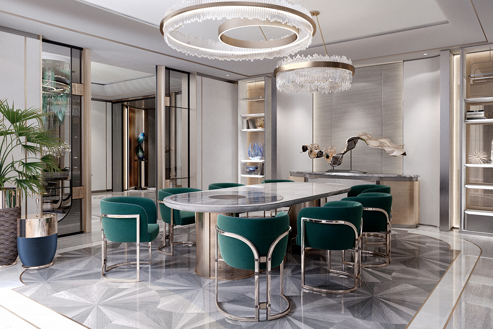 The interior of the dining room is based on two accent points: a painting by Chinese artist Lu Jianjun and dining chairs, the decorative effect of which equalizes the composition of the room. The rich emerald color of the upholstery of the chairs supports the shade of the central chandelier in the hall and continues to develop the color scheme of the interior.The oval shaped chest of drawers harmoniously fits into the curved shape of the central pier, designed as laconic form to be a basis for a dynamic sculpture.
