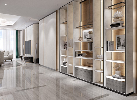 The design of the bookcase is an architectural solution that breaks the monotony of the very long wall. The use of common materials in the finishing of the sidewalls, as well as a decorative glass with a metal grid in the rear panel, matches other techniques in the interior.