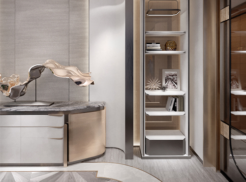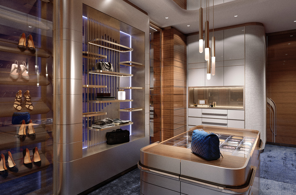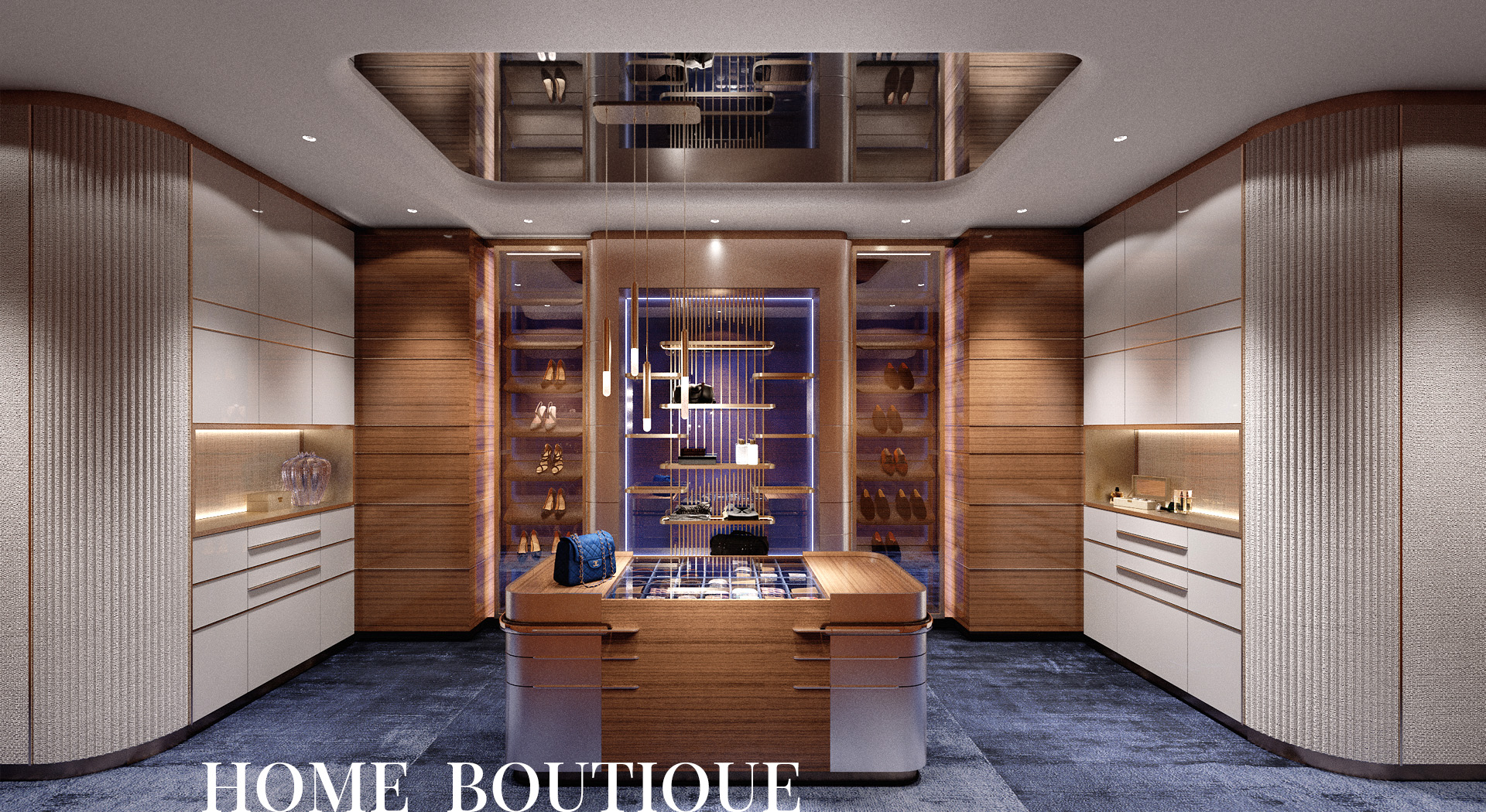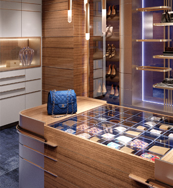 The symmetrical layout of the wardrobe underlines the classic method of organizing of a space. The use of open and closed functional furniture modules allows for the most ergonomic organization of the storage system.In addition, the combination of polished veneer with matte genuine leather and with a waxed sheen of metal in the decoration, creates an elegant image of a private “boutique”.