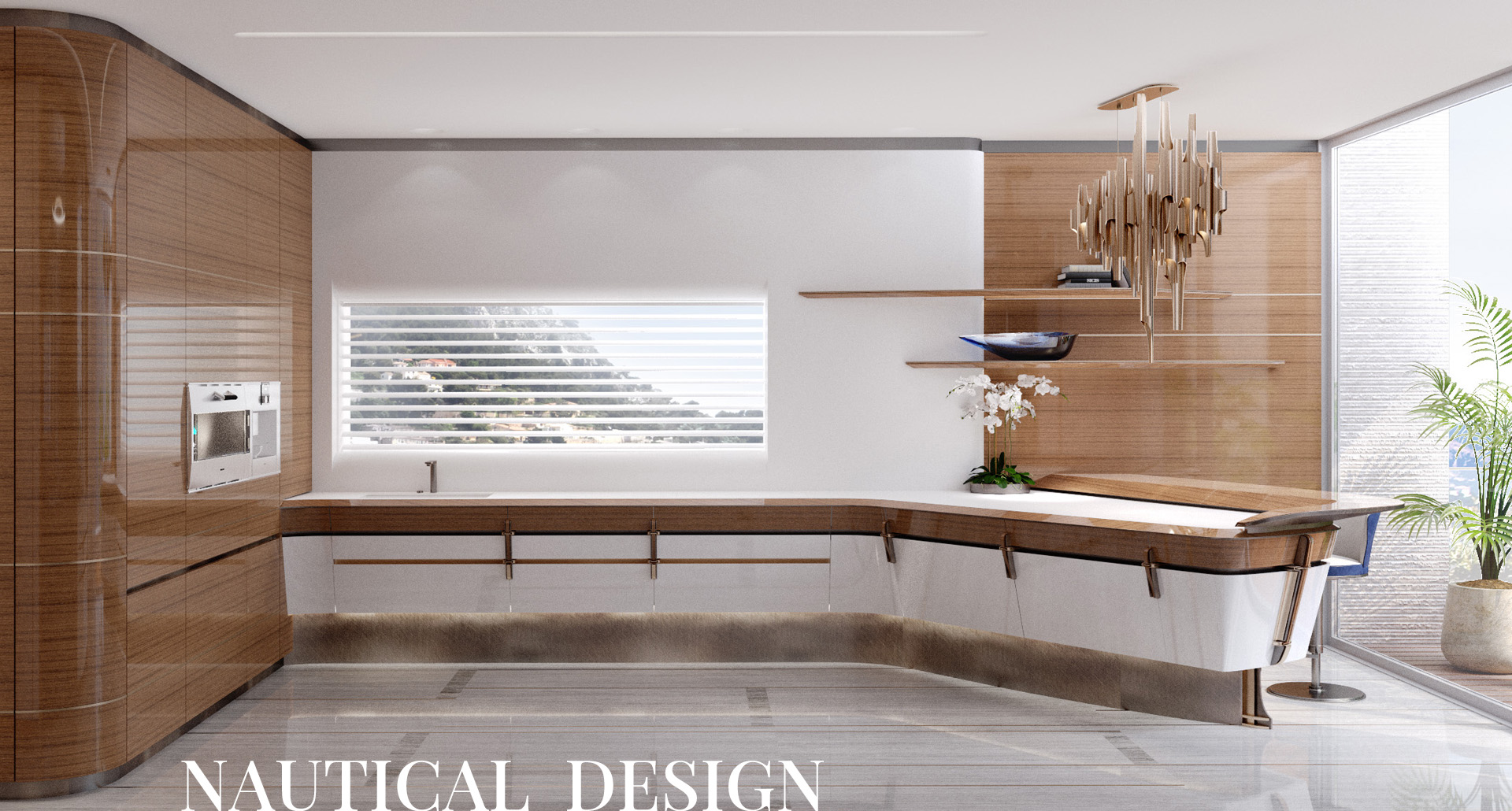 The client's personal passion for sailing and for classic wooden yachts makes the basis for designing of the kitchen's interior.