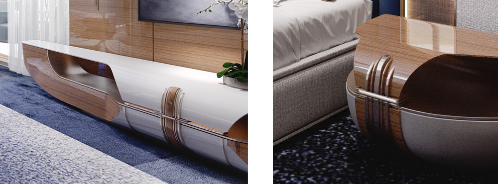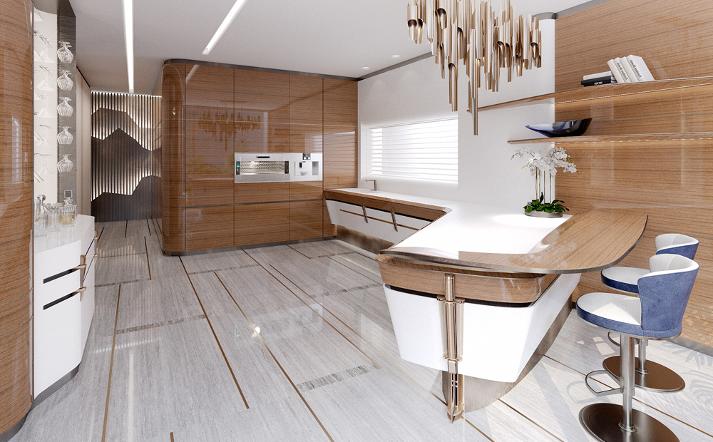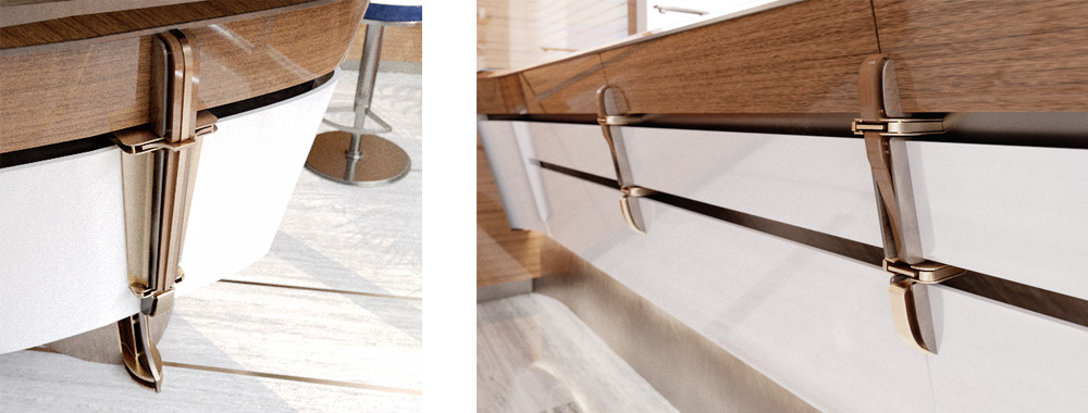 The use of multi-layered polished varnish in the decoration of facades and panels, Corian - for curved surfaces and bronze in handles, in profiles and in decorative elements - all this creates the image of a classic wooden boat, while retaining the functionality of the kitchen.