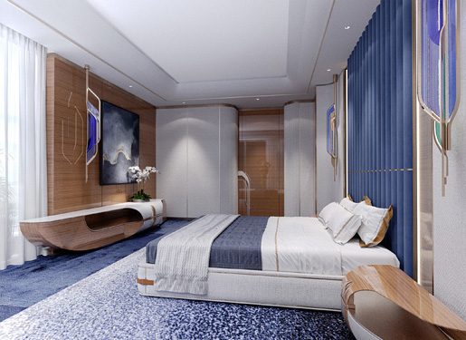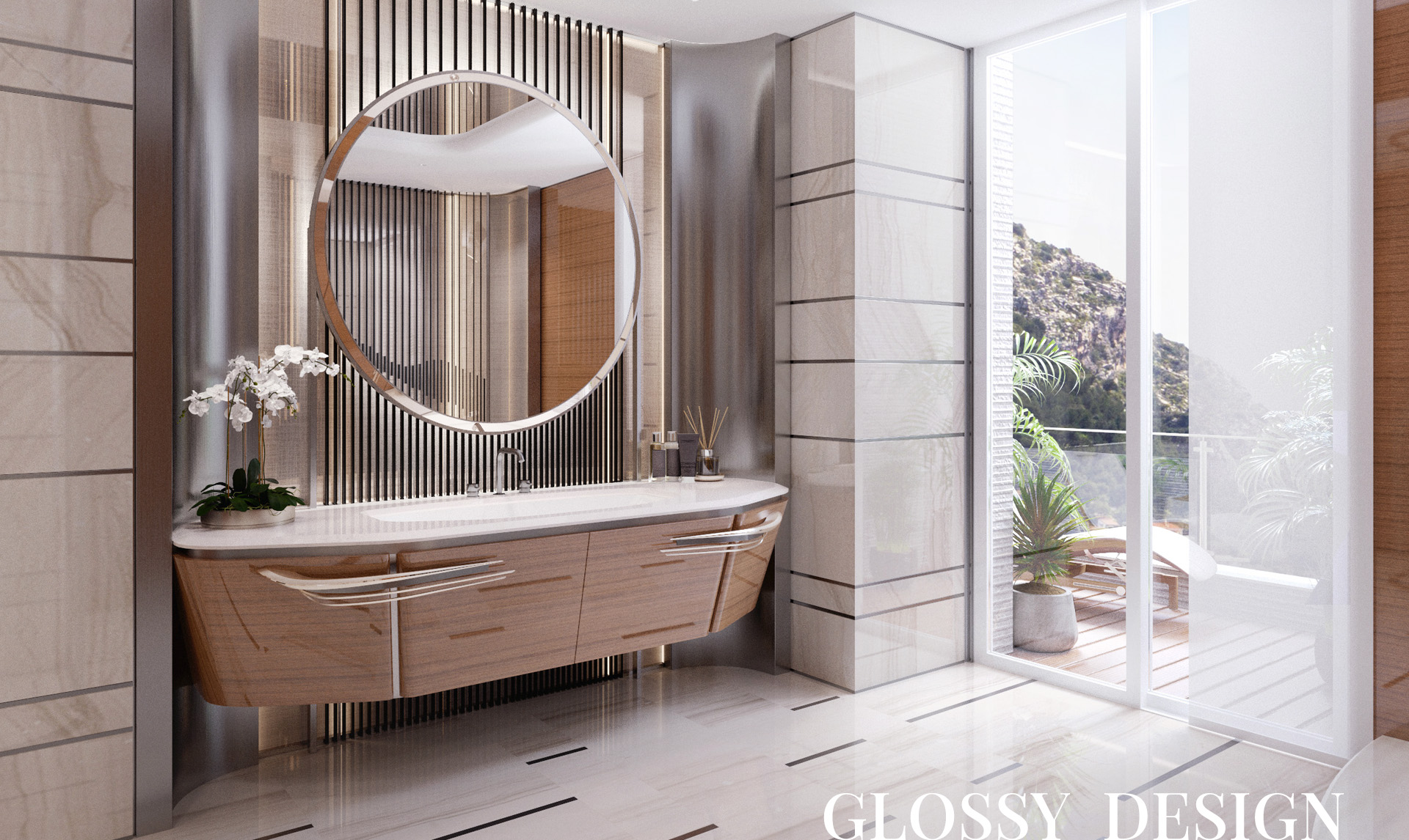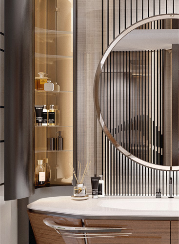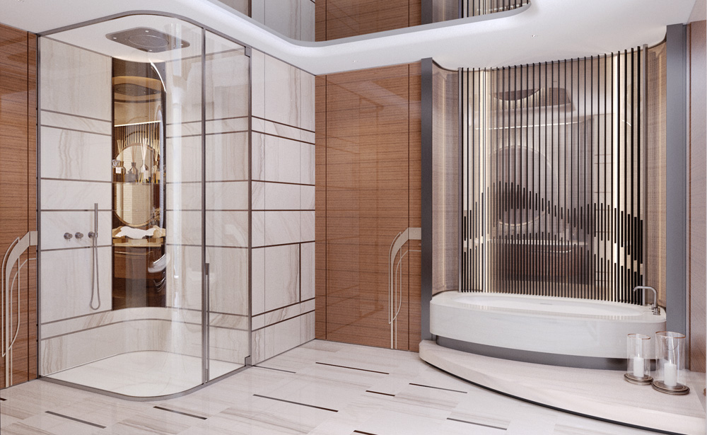 The bathroom of this “male” wing continues the development of its stylistic theme. The composition with a sink, built into the existing architecture of the walls, is a functional unit with curved side penals which provide a convenient storage for bathroom accessories. The hanging module with build-in marble sink, also has a shape distinctive for a boat.The graphic line of the the shower cabin's profile - enclosure deliberately emphasizes the semicircular shape, while the organized niche of the bathtub with a mirrored back panel not only breaks the wall plane, but also supports the decorative technique used in the composition with the sink.