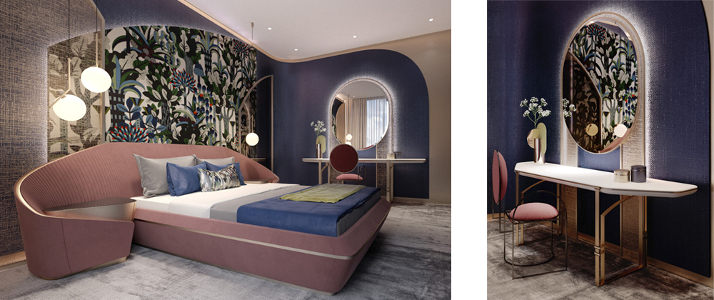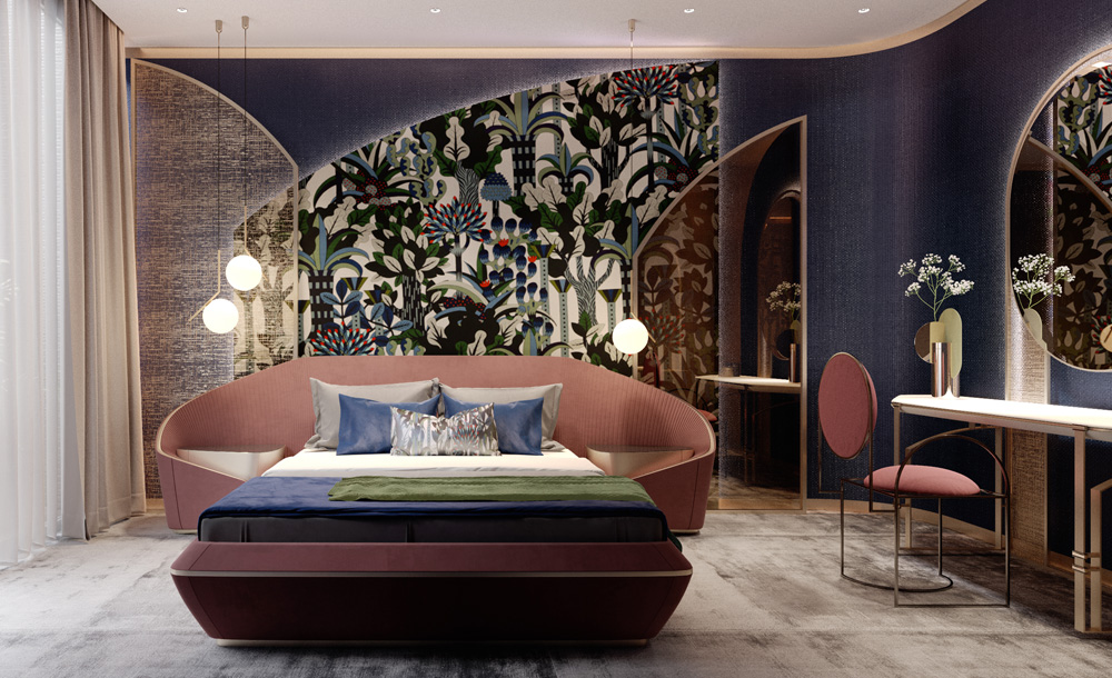 Dressing table with its forms supports the design concept of the 60s and compositionally organizes the surface of the wall. The combination of different textures creates a bright and non-trivial interior, the dark background "pushes the boundaries" of the room, and the emphasis is focused on the decorative screens behind the bed. All this shifts attention from a small area of the room towards the design.