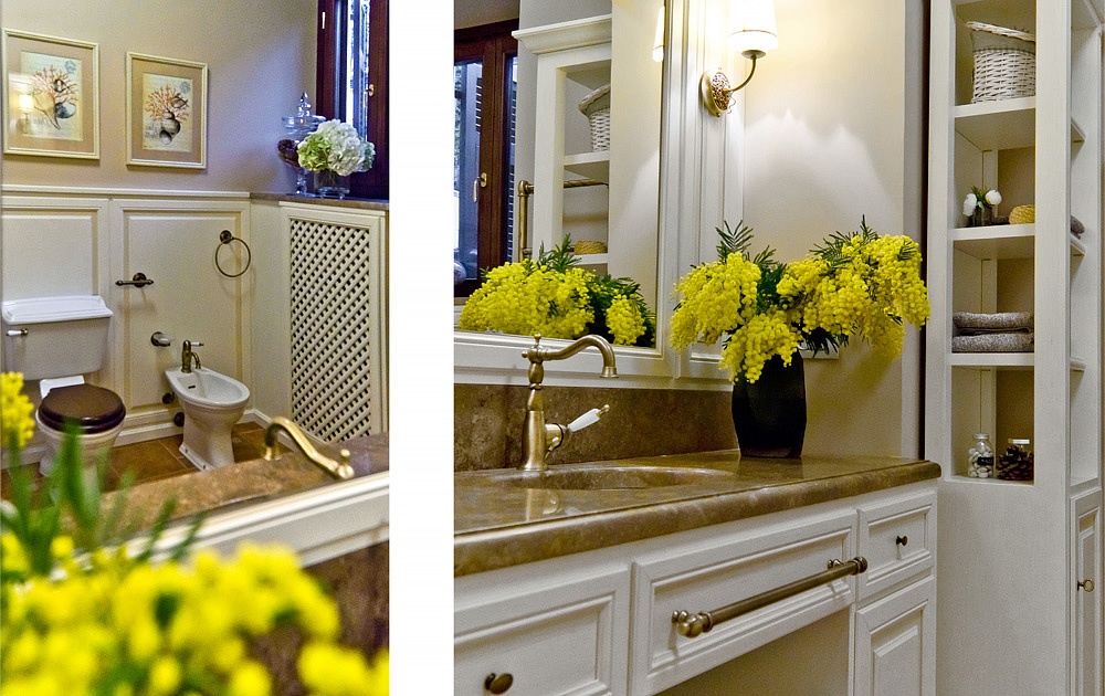 The Italian Provence always begins with the kitchen. Exactly a kitchen is a real “heart” of a house, it unites people and fills a house with a odor that are warm to the heart.This kitchen made in a traditional style: wooden facades in a light colored finish in combination with marble - the Rosso Verona for the worktop and bronze fittings creates a lightsome and soft image, filled with lovely details.