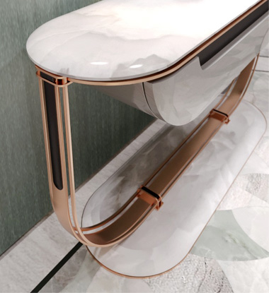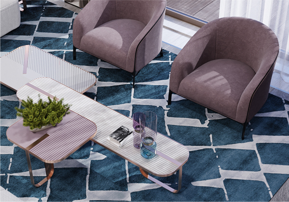 Genuine leather in combination with linen texture is in harmony with the delicate brilliance of bronze, and the horizontal texture of natural silk “soothes” the woven texture of the carpet.