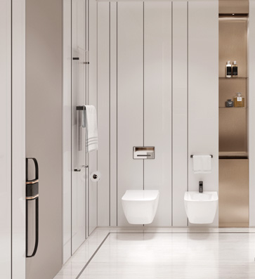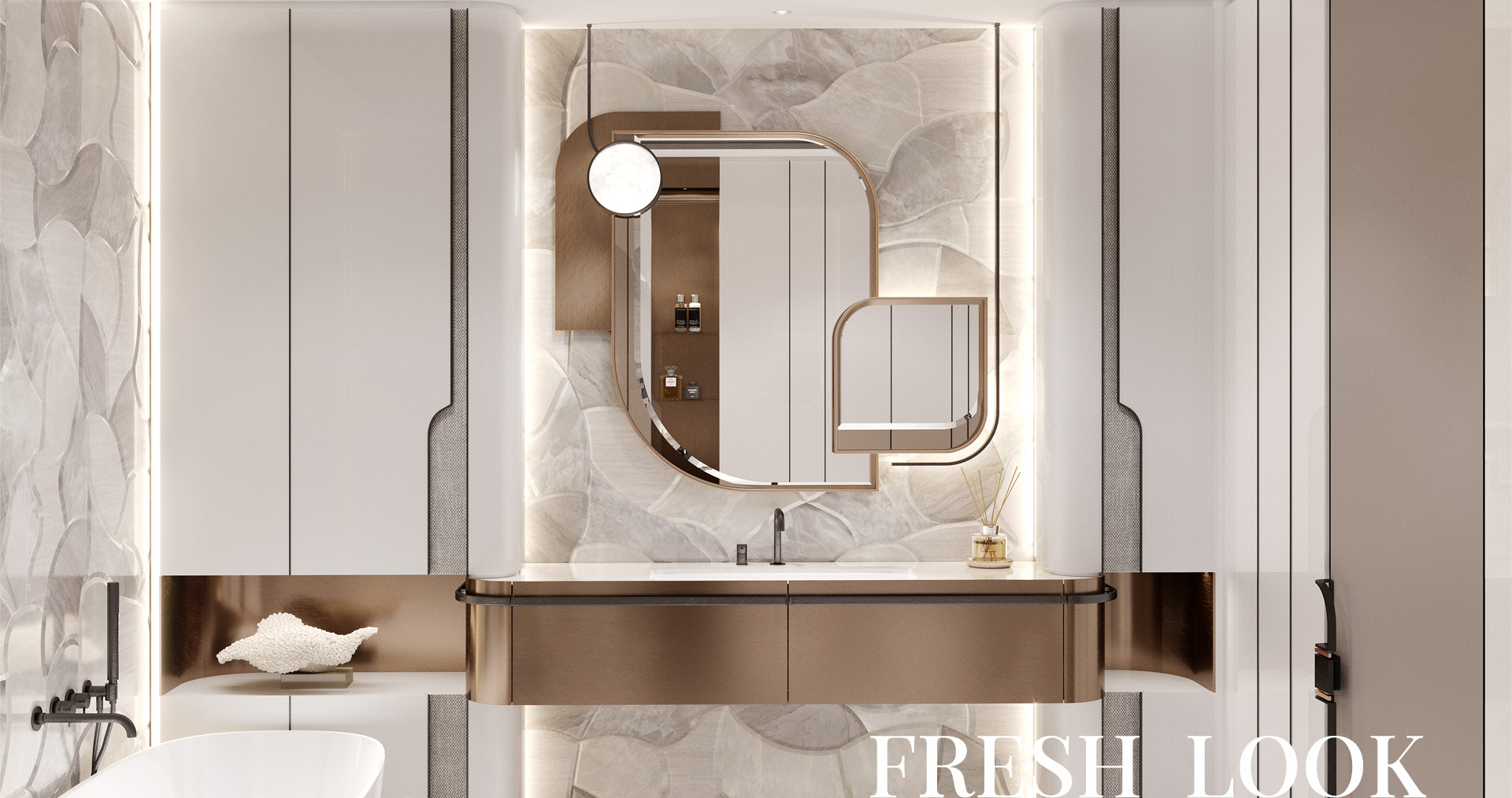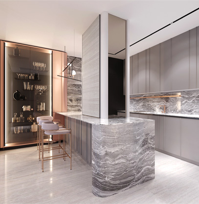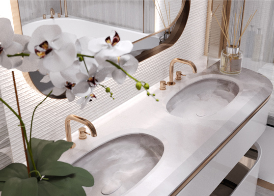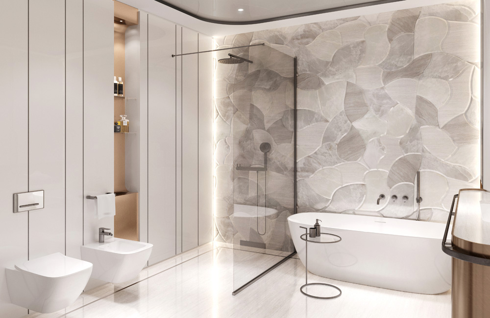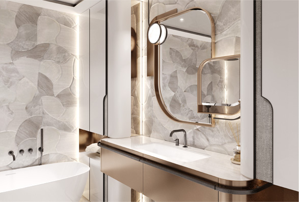 The lit piers are decorated with Bianco Venezia marble with a horizontal texture finishing, which creates an additional multi-layered effect and visually expands the volume.