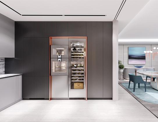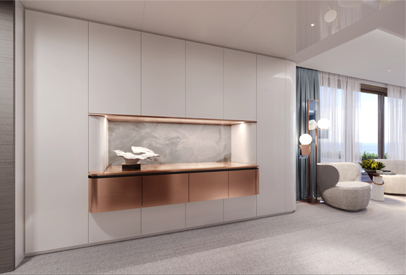 A small private bar is designed as an in-built composition with hanging modules in champagne lacquer finish, which have a double lifting top.