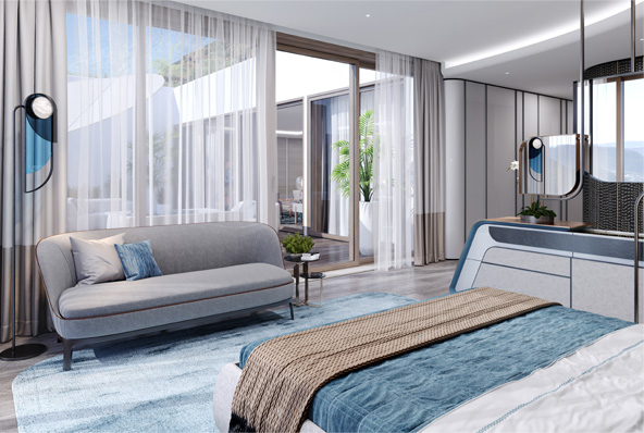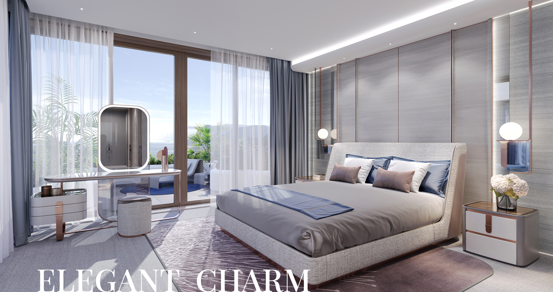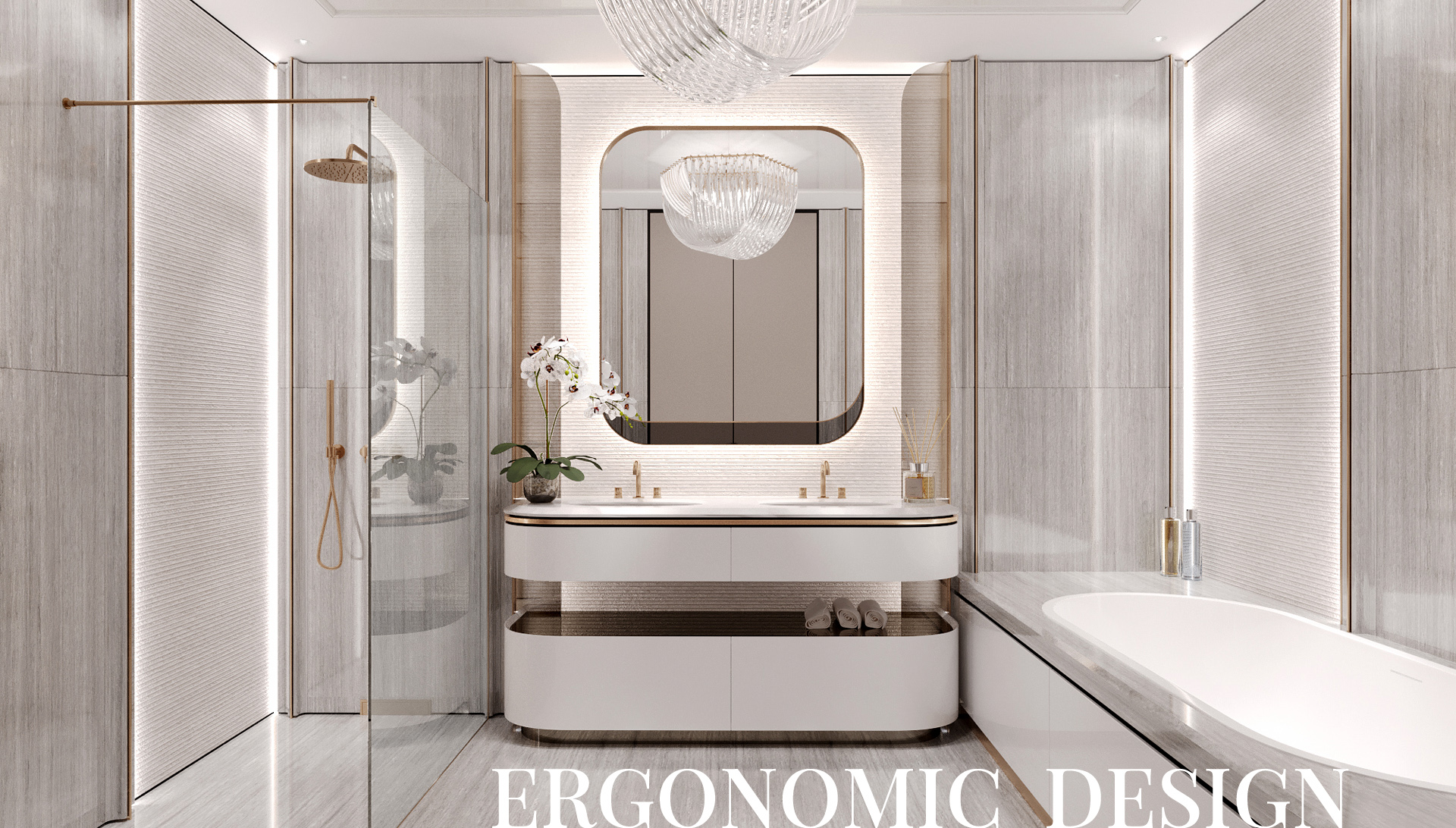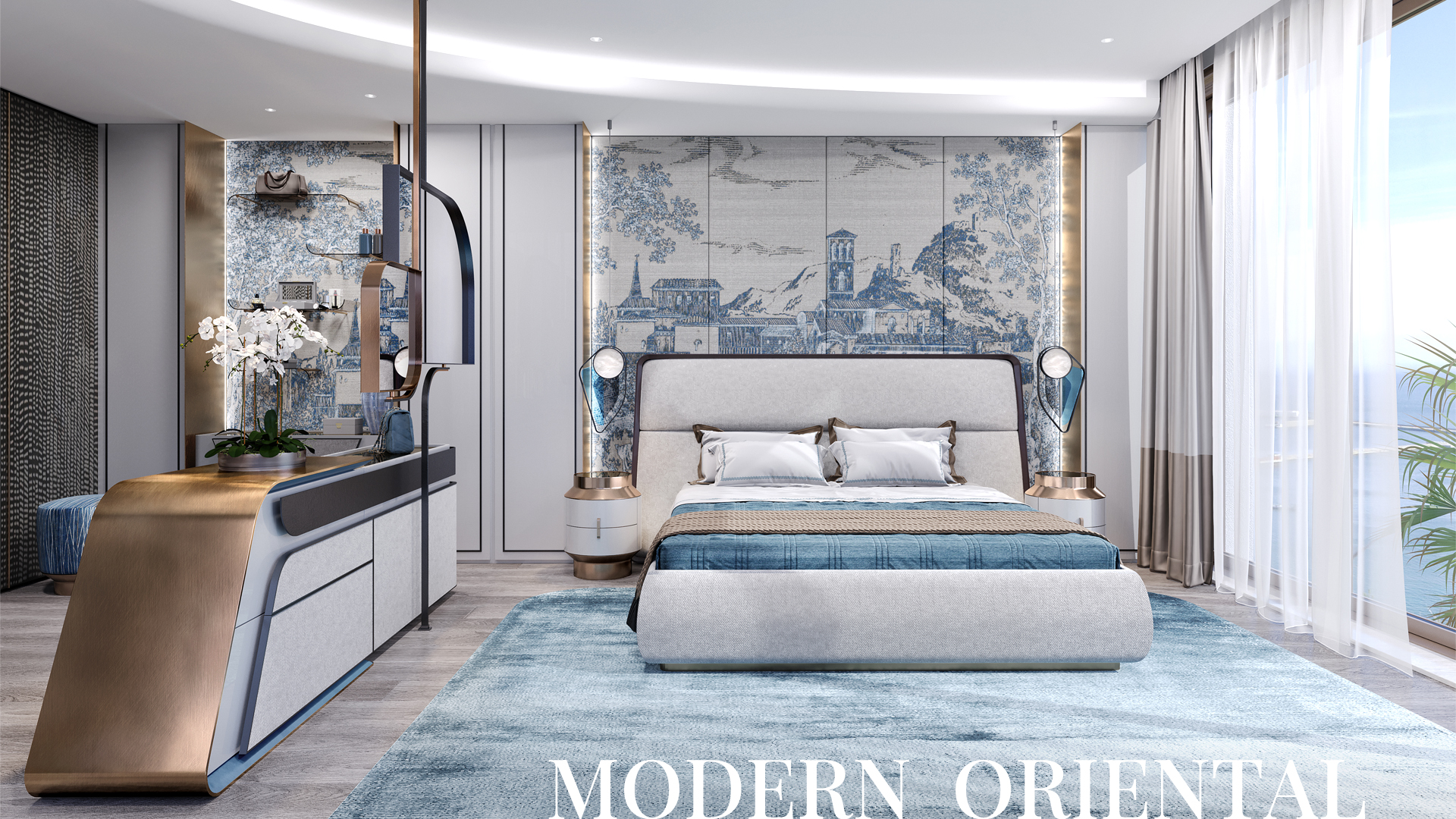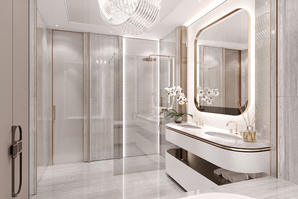 The interior of the master wing is made in the style of Luxury Contemporary with a calm monochrome palette with individual elements characteristic of the Art Deco style.
