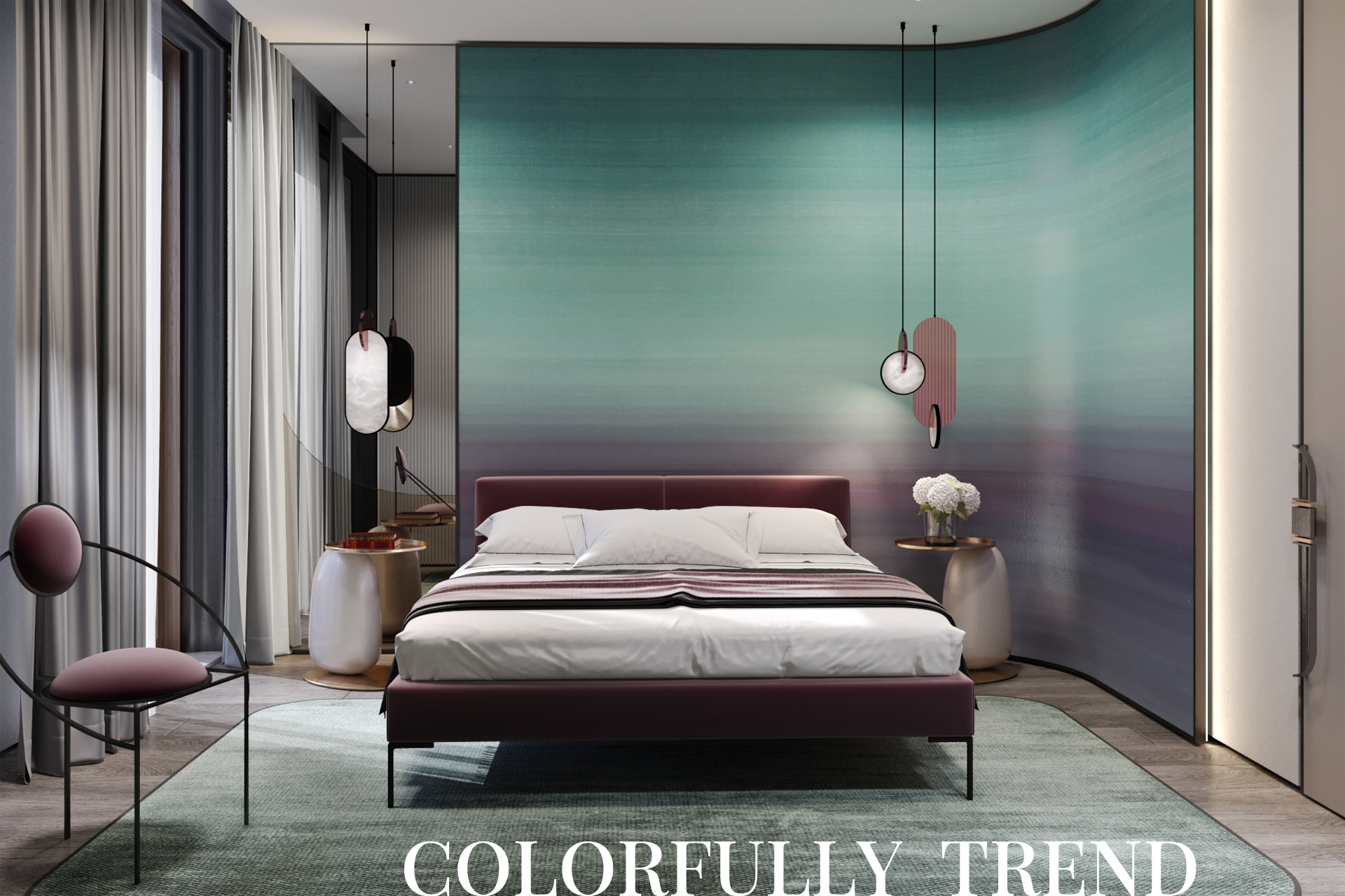 The complex combination of shades of lilac and emerald is another modern design trend, used in this interior. The mix of dusty pink color and the texture of brushed bronze creates a non-trivial image even in a small space of the guest bedroom.