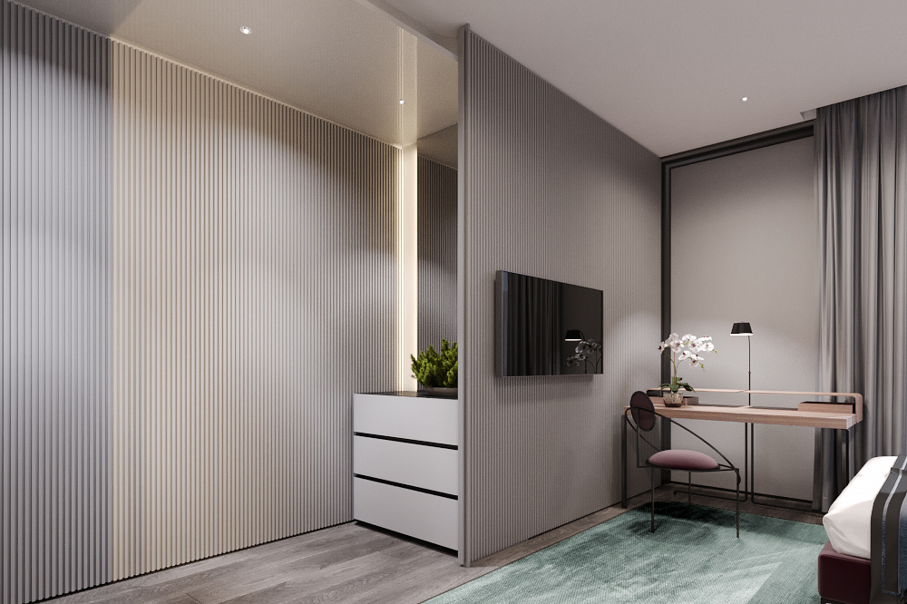 Dressing table with its design supports the overall concept of the guest bedroom.